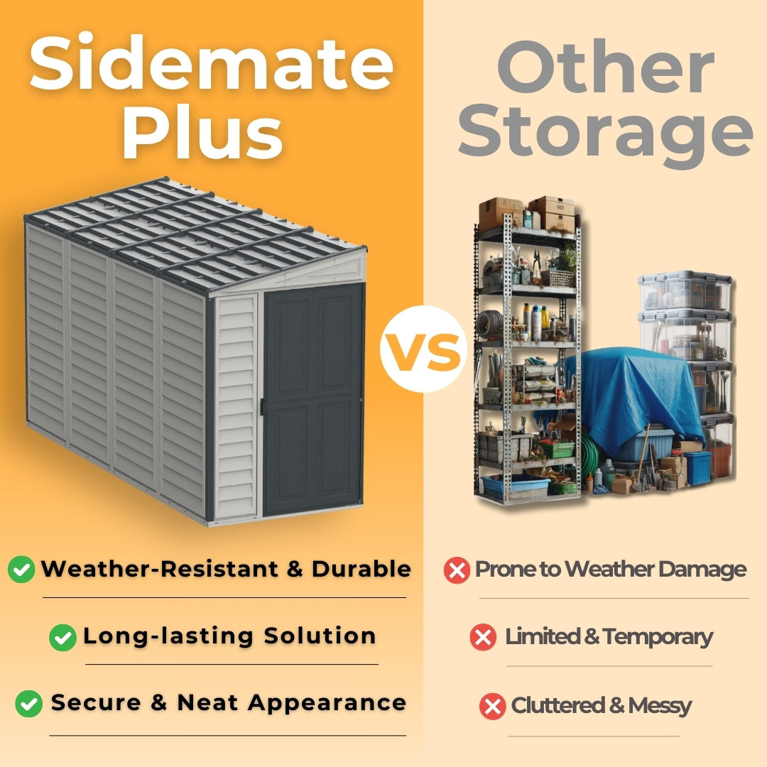 Modern, Maintenance-Free Storage Built for Tight Outdoor Spaces The Duramax SideMate Plus Shed 4x10 in Adobe & Dark Grey is the perfect solution for maximizing narrow areas along fences or homes. With durable vinyl construction, a reversible side door, and reinforced steel framing, it combines sleek design with long-lasting utility.