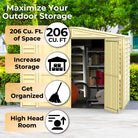 • 208 Cubic Feet of Storage Spacious design fits lawn tools, bins, or bikes