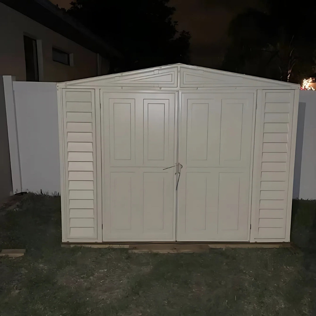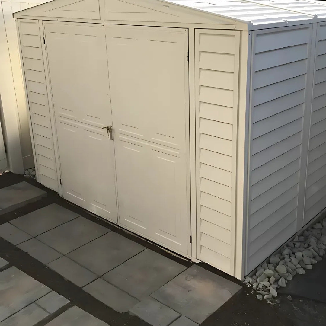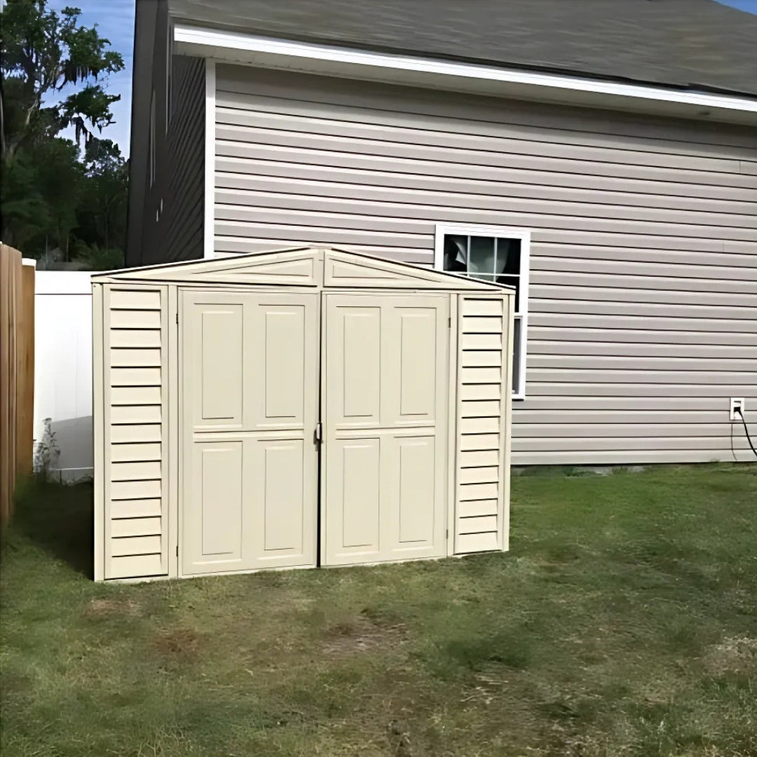 Spacious, All-Weather Storage With Quiet, Maintenance-Free Performance The Duramax DuraMate Shed 8x8 in Ivory is a durable, walk-in outdoor shed designed to handle harsh weather while keeping your gear protected year-round. With reinforced steel framing, wide double doors, and a skylight for natural light, it’s a smart and sturdy solution for backyard storage.