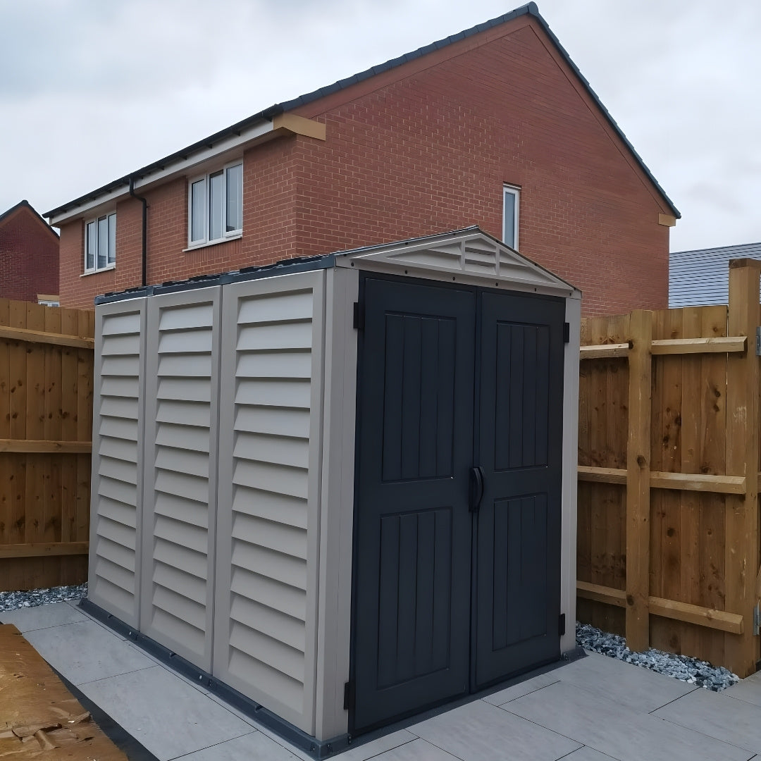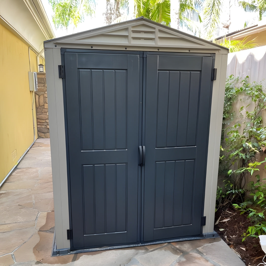 Compact, Durable, and Built for Everyday Outdoor Storage The Duramax YardMate Plus Shed 5x5 in Adobe & Dark Grey is a space-saving, all-weather storage solution ideal for patios, side yards, or small backyards. Built from durable fire-retardant vinyl and reinforced with steel, it’s made to last with minimal maintenance.
